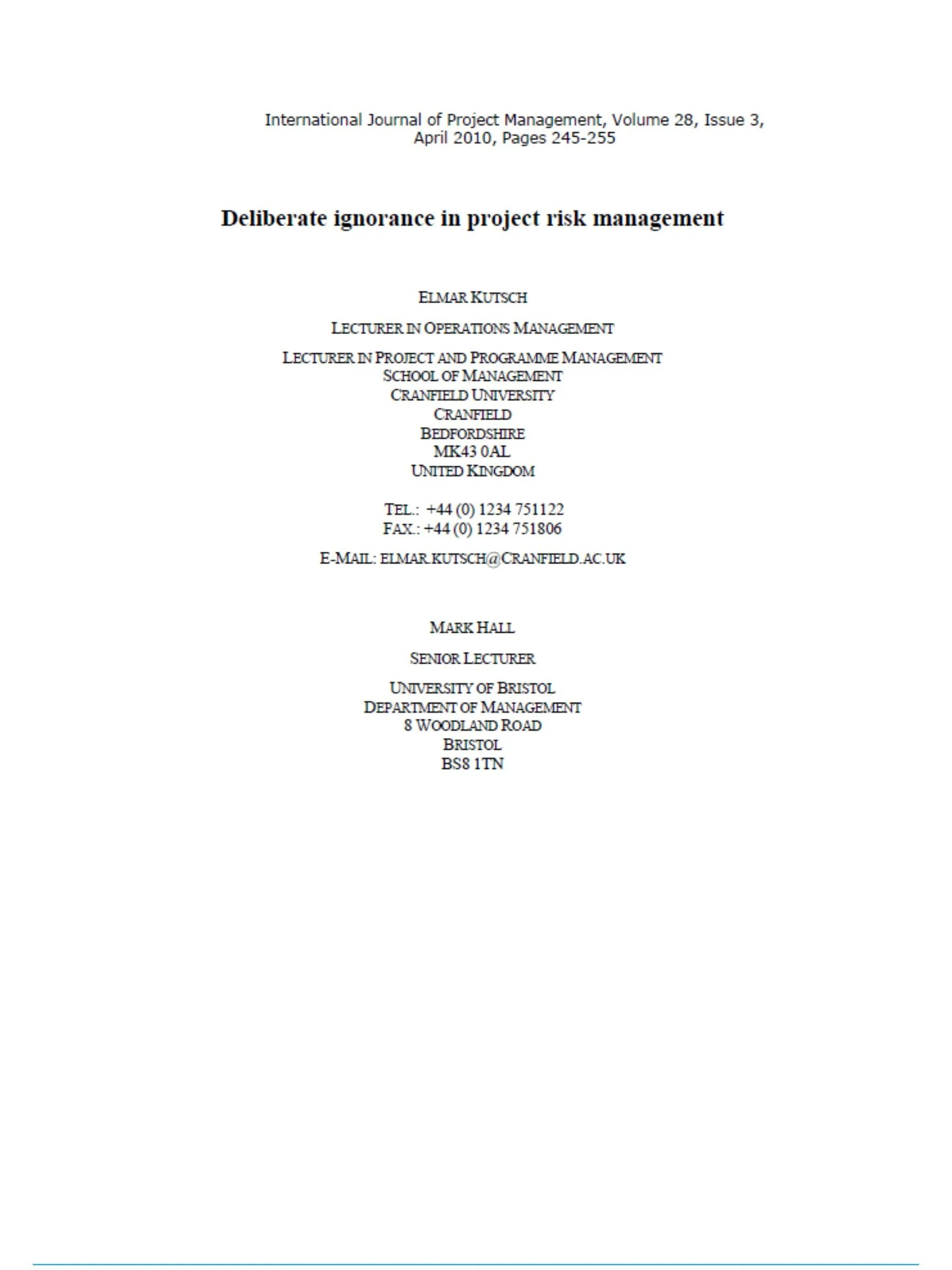 SUMMARY: Through 18 interviews, this paper shows project teams often choose to ignore certain risks for political or reputational reasons. Four behaviours—Untopicality, Undecidability, Taboo, and Suspension of Belief—turn risk management into a symbolic process rather than a preventive one.